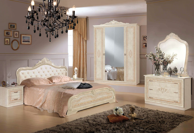 Полный комплект спальни предполагает: шкаф, кровать, зеркало и комод, две прикроватные тумбы